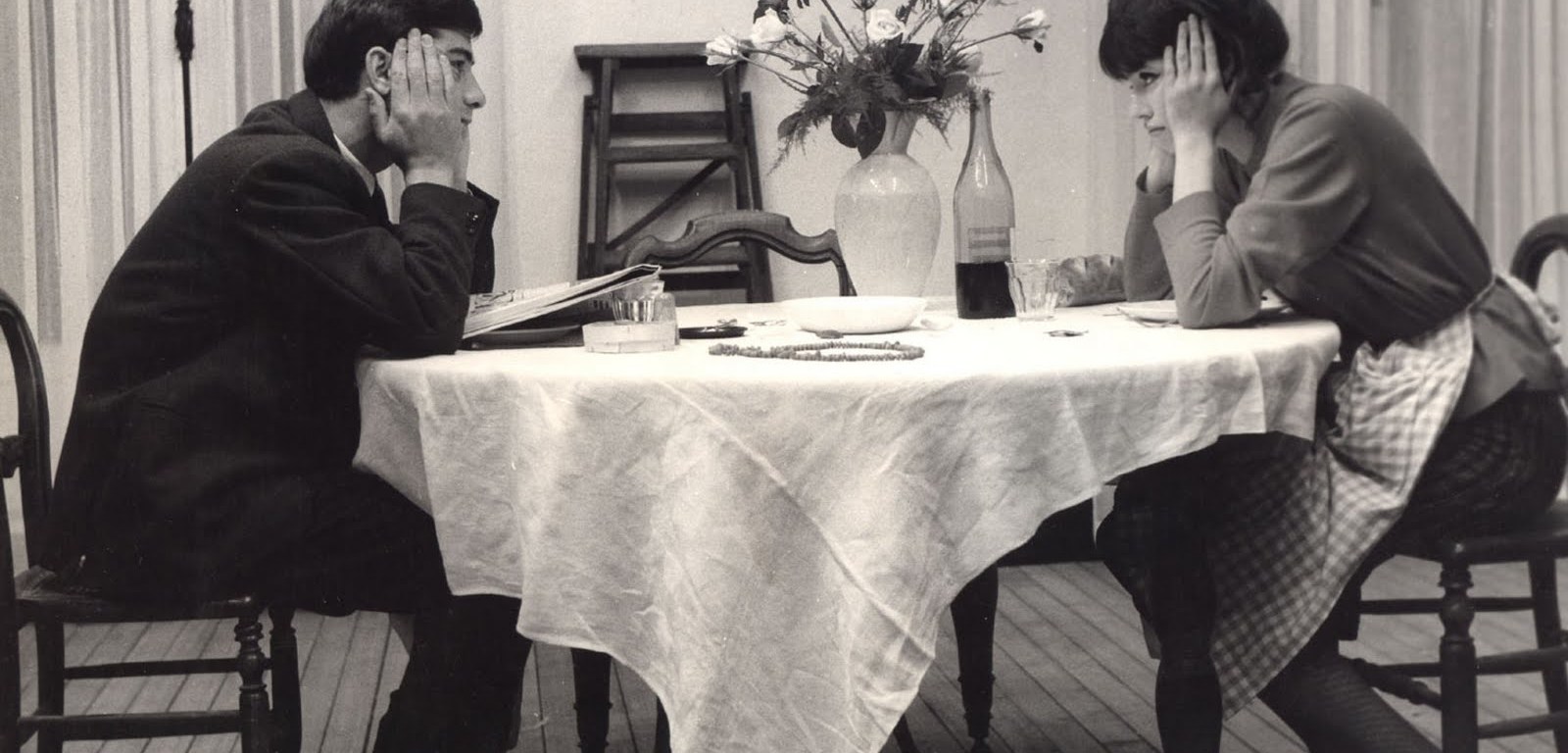 Dramatic musical motifs appear when characters speak certain sentences.  The dialogue isn’t dramatic but the music is, as if Godard is trying to parody the more conventional uses of music in romantic dramas.  Even in the film’s first movement, which in normal circumstances would seek to reinforce the narrative reality, music is used to completely destabilise it.  Name checking fellow directors in the French New Wave movement would become one of its traits and, here, the name check of Francois Truffaut brings the drama out into the viewer’s reality by an odd use of music and sound.  When asking another character where she has been, she at first doesn’t tell the character through words but instead mimes out the title of Truffaut’s Shoot The Pianist (1960).  This isn’t just silent but is accompanied by the sound of gun fire and a short piano motif.  While this seeks to question where the reality of the film sits in relation with the viewer’s, it doesn’t seem as surreal as it sounds on paper, especially when a few scenes back, the characters both acknowledged their role as performers and bowed to the audience before starting the drama of acting.  In other words, this moment of surrealism is tame.