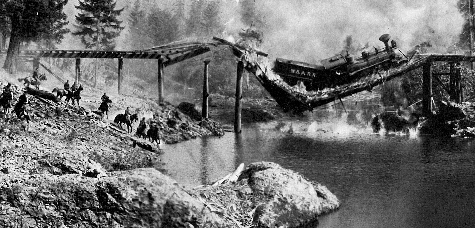 Fast forward thirty years and the train is again defining the movement and rhythm of cinema, this time in a more comedic form. Buster Keaton’s The General (1926) is one of the era’s defining films, showing expert use of pathos, physical daring and a beautiful eye for imagery. It’s a fitting progression from the Lumière’s train in that the camera has now learnt to move. While the former set up the parameters for the rhythm, the latter expands on it allowing the camera to move in all directions, following the train while at the same time starting from the basic premise of documentation, this time alongside of fictional events. Keaton’s film however also manages to blend the same sense of worrying documentary in his film with the obviously dramatic elements. As the train of the enemy genuinely crashes through a burning bridge while being shot in side profile, there’s little to distinguish this crash from Lumière’s oncoming train when taken out of context. The rhythm has only vaguely changed, in some ways allowing Keaton’s train to become the number of beats in the rhythm while still using the basic note types of Lumière’s (in other words the two trains together represent the simple time of silent cinema and seem to fit allegorically around 4/4).