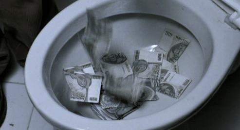 The slow process of the destruction of all of their possessions takes up the majority of the film, the action shown to be a necessary step in their collective suicide. While there could be an anti-materialist reading to this, especially when money is ripped up and flushed down a toilet, the visual action of it implies more of a release than a protest. These possessions are a barrier. They are the final hurdle between the family and their succumbing to the Death Drive. It is only when a fish tank is smashed and the fish are left to die that the little girl becomes aware of the consequences of death.