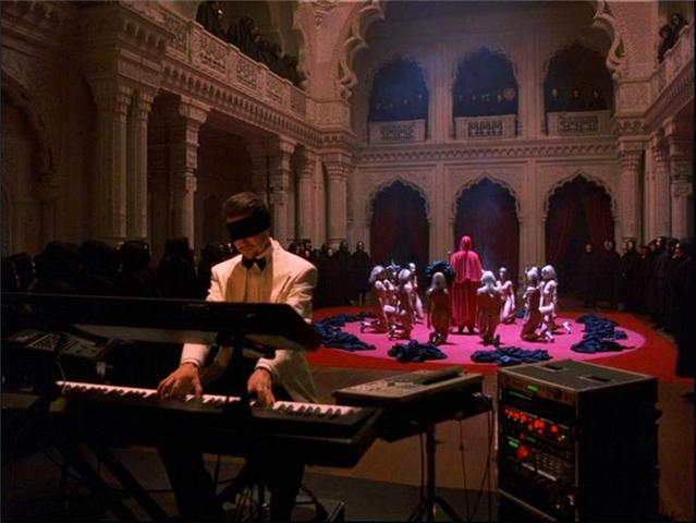 His chaperoning of two good looking women in front of his wife while she herself flirts alarmingly passionately with a much older man seems more jovial and less ritualistic before the watershed moment of her admission. Even the discovery of a young prostitute overdosing in a bathroom upstairs is treated as a calm consequence rather than a dark and morbid visualisation of someone’s desperation being exploited by another’s sexual wants (perhaps even the group at the heart of the film). Post-admission, William becomes involved in a number of activities that force him to confront the power of sexuality. All of a sudden, the people around him are all under its spell, either because they require it (the Japanese men in the costume store), because they can make money from it (the owner of the costume store) or both (the underage daughter of the costume store owner). The main implication of this sexual occultism, veined through New York like an underworld, is William’s eventual journey towards the ritualistic, private ceremony and orgy at the mansion house where his friend plays the music (blindfolded and unaware but happy to be paid).