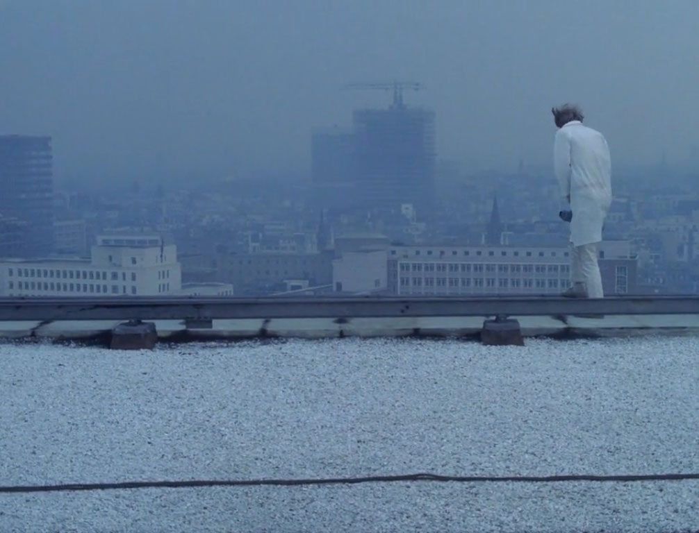The colours are a murky shade of blue with city mist melting away the other Brutalist boxes that have shot up. As Max edges closer to oblivion, St Paul’s lies in the background, almost mocking him of his country’s history as opposed to his position on a bland, nameless building. From the beginning, he is wearing all white, like some tormented angel that has already fallen far before his newly intended fall. He seems to be designed like a Brutalist building itself: sharp cheek-boned corners, empty eyes and windows sticking out from the Gothic excesses of empire that still linger.