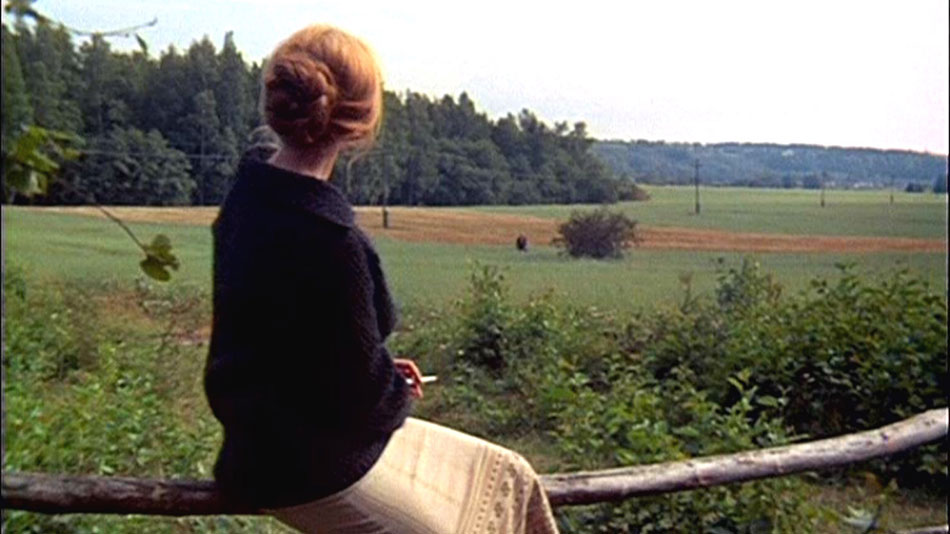 The scene begins after the film’s opening of a young boy going through speech therapy. The contrast between the tones and colours of the film is extremely apparent as a scratchy, pre-existing form gives way to the more gentle tones of the natural landscape. A woman is sat smoking on a fence that leads to her house, watching for something (which turns out, in practice to be nothing). A man appears further down the field path and makes a turn by a tree upon seeing her, claiming to have lost his way. He is a doctor on his way to the nearby town. The pair briefly talk before the weight of his body on the fence upon which she sits breaks the beam. They fall. The man takes open pleasure in this (“It’s a pleasure to fall down with an attractive woman.”) and the woman frustrated brushes herself down. He leaves but, as he does, something stops him; some sort of realisation. He turns back to look at the woman and, as he does, a strong breeze rises up from nowhere, curls around the long grass and departs. He follows suit.