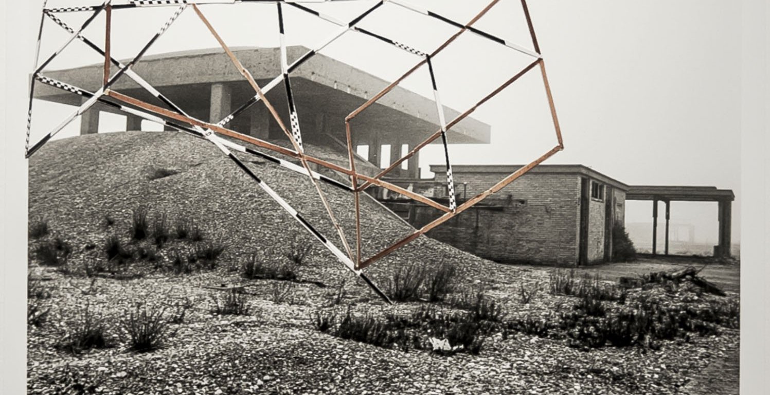 Blind Landings follows this relationship onwards in its photographs by using a collage technique to further break the shapes of the place with even more yard measures.  The geometric patterns map onto the  images of the buildings and the pagodas, becoming reminiscent of the aerial mapping images commonly associated with the site, especially of Cobra Mist.  The act is, however, temporal, but it is a far more circular act than Sebald’s writing because the newly added patterns on the photographic works deliberately stand out from the grainy 35mm images on which they were initially placed.  Whereas the sculptures and the soundwork are clearly intended to heighten the dereliction of the places through an ironic anachronism of new but subtle additions to the laboratories, the photo collages create an entirely circular logic by following Sebald into that parallel perceptive dimension that he slipped into when visiting the Ness and revelling in its potential, of which the history is measured; the dereliction of both time and space being documented yard by yard.