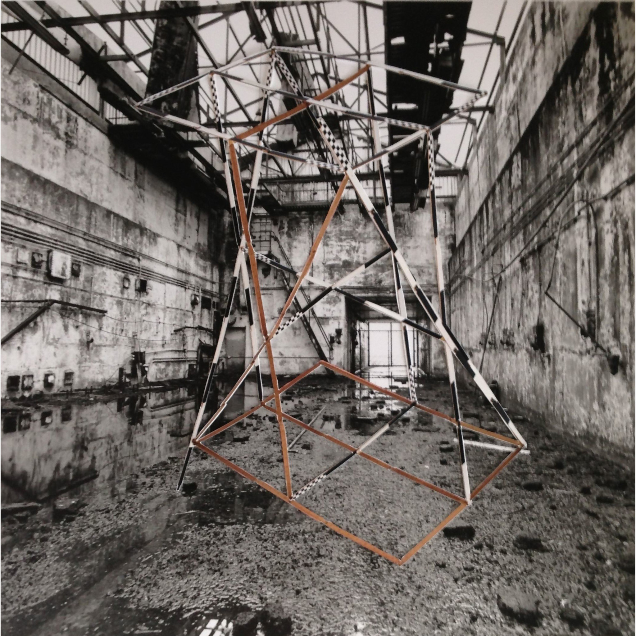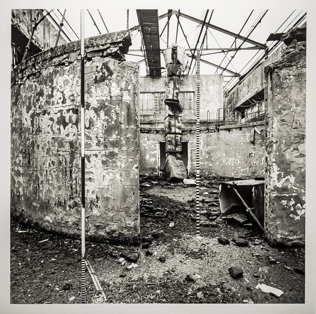 Though Blind Landings (named after the experimental unit that worked in the area during the Cold War) largely manifested in onsite sculptures and sound pieces placed throughout the laboratories, it is in the collage-collated photographs where Blind Landings as a thematic meme is at its most interesting.  Video footage of the artists installing the work shows how precarious the space is but, essentially, the video shows how well the Wilsons’ sculptures sit within the space.  The long, measurement lines of black and white striped yard sticks, hinting at the various impact and landing experiments done on the Ness – at the labs here, at RAF Woodbridge down the road, and the adjacent Cobra Mist aeronautical site – creating strong lines in spaces where the dilapidated wear of the coastal climate has already spliced together girders and other fragments of buildings into a variety of contortions.
