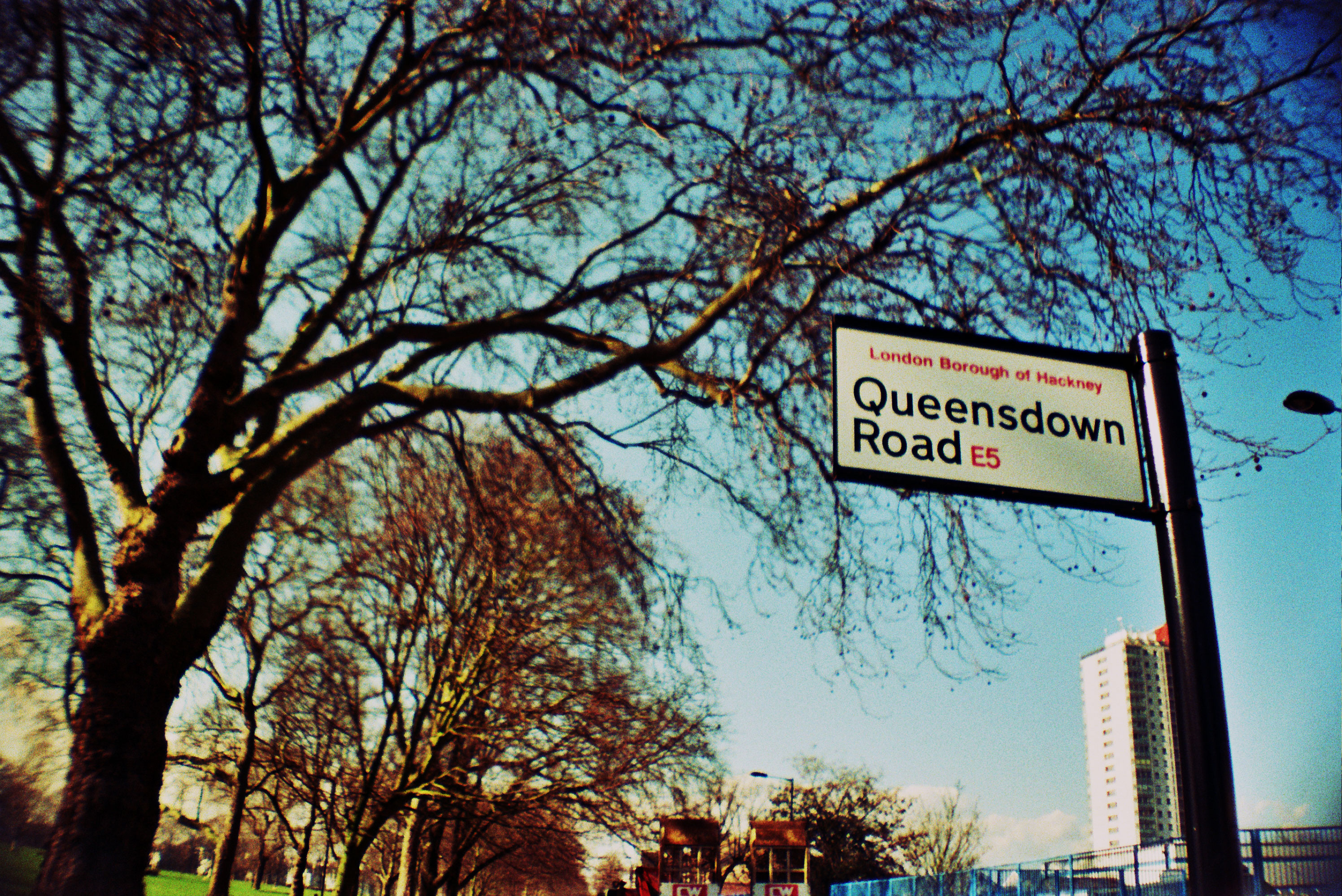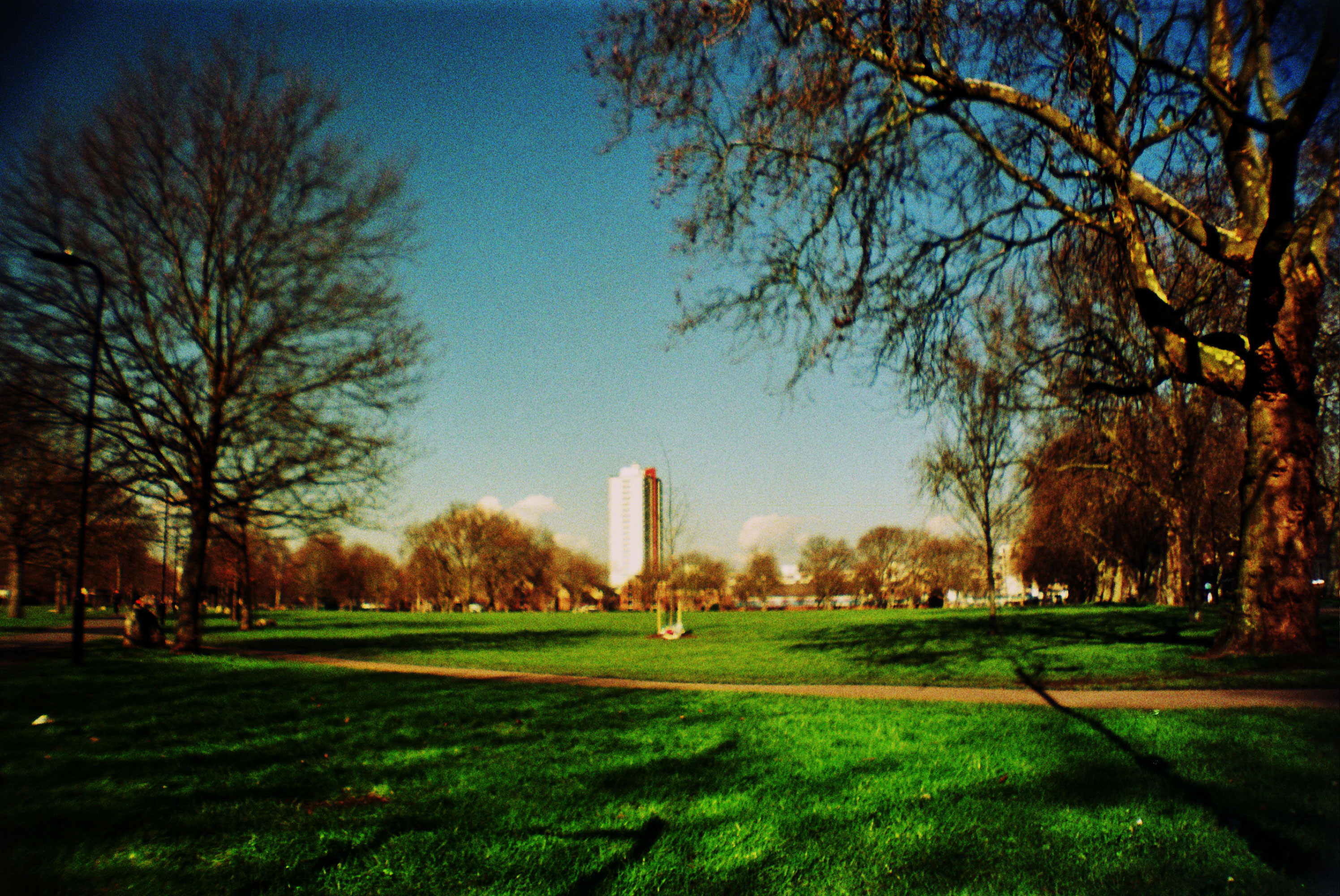 We followed Amhurst Road, leaning right towards Hackney Downs. Another park to wander around in, to fire up conversation and to explore. The high-rise in the background shot up among the trees and the sun shone down on the relatively empty but pleasant lawns. A handful of joggers and cyclists were making their way around the paths though no one was declaring lines of Webster into the wind.