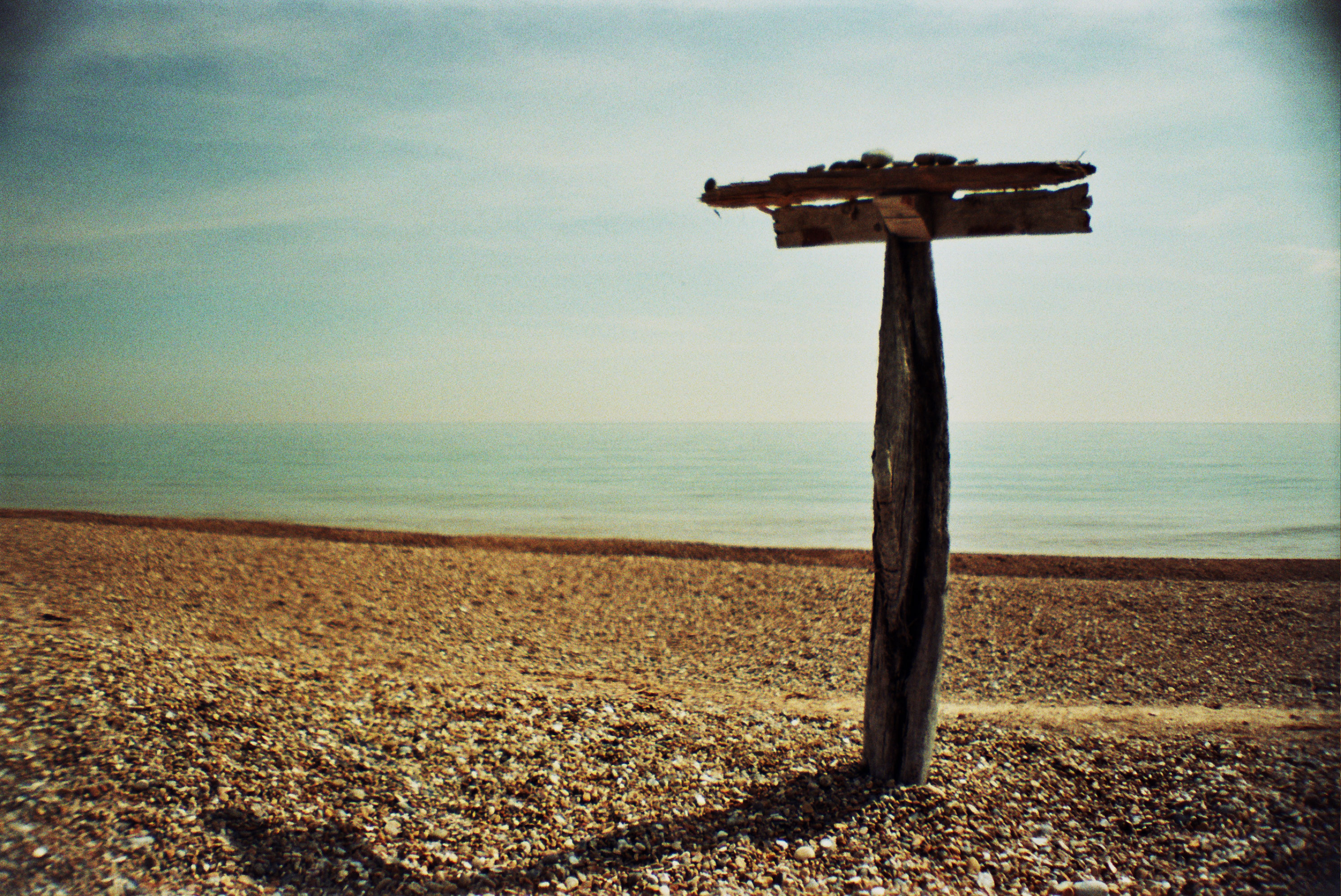 My walk was the same, and I took great pleasure at feeling at some ineffable mercy of the landscape. Sadly it was only to be the sun burning down upon my own neck that would later haunt me for days afterwards. This sense of being alone was broken almost instantly when I came upon a strange, man-made monument constructed some way down the beach. It was not near enough to the slowly approaching Minsmere reserve or to the cafe back at Sizewell to be of easy reach and yet here it was; standing like a lost totem to some unknown nuclear god.