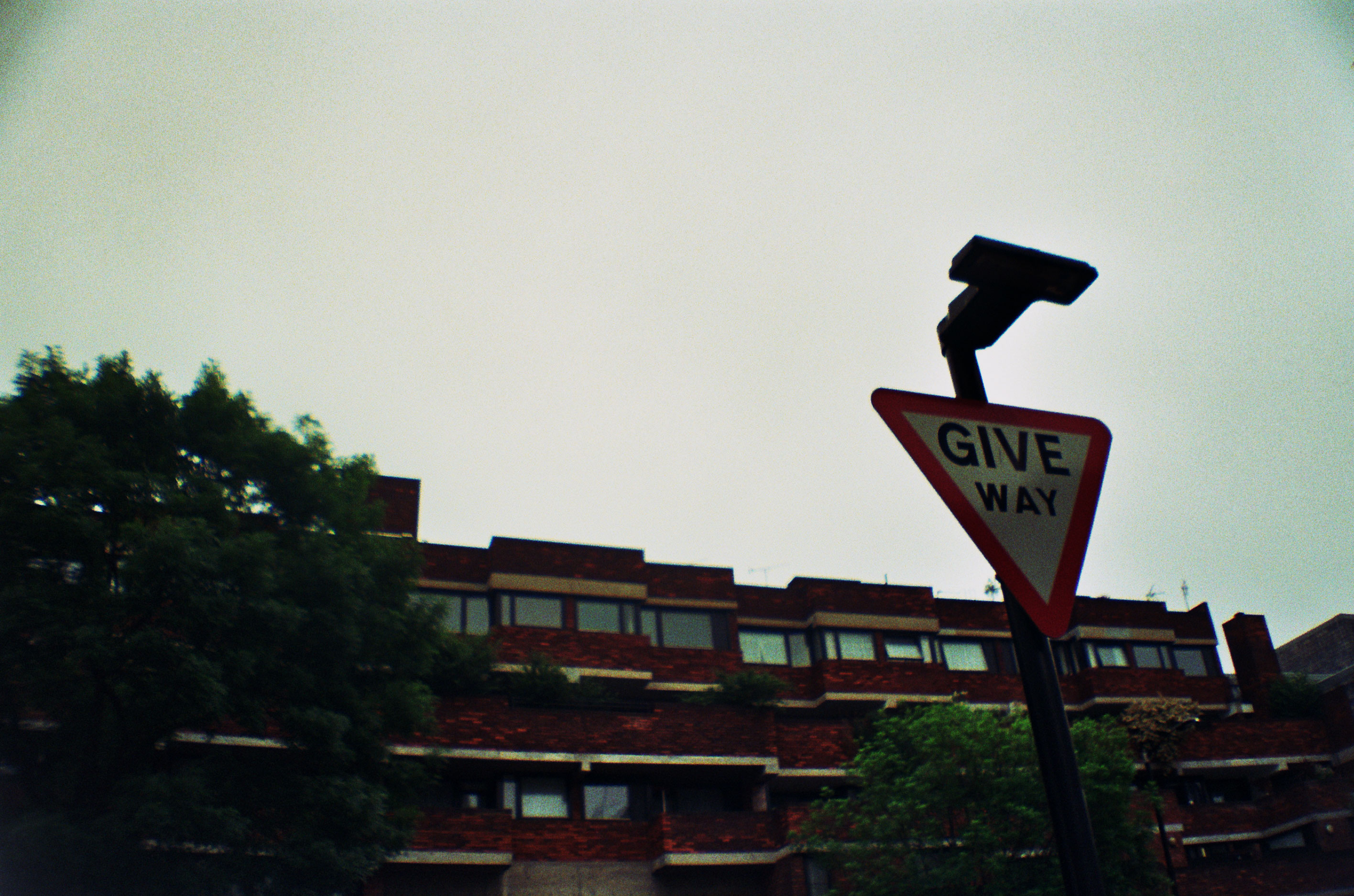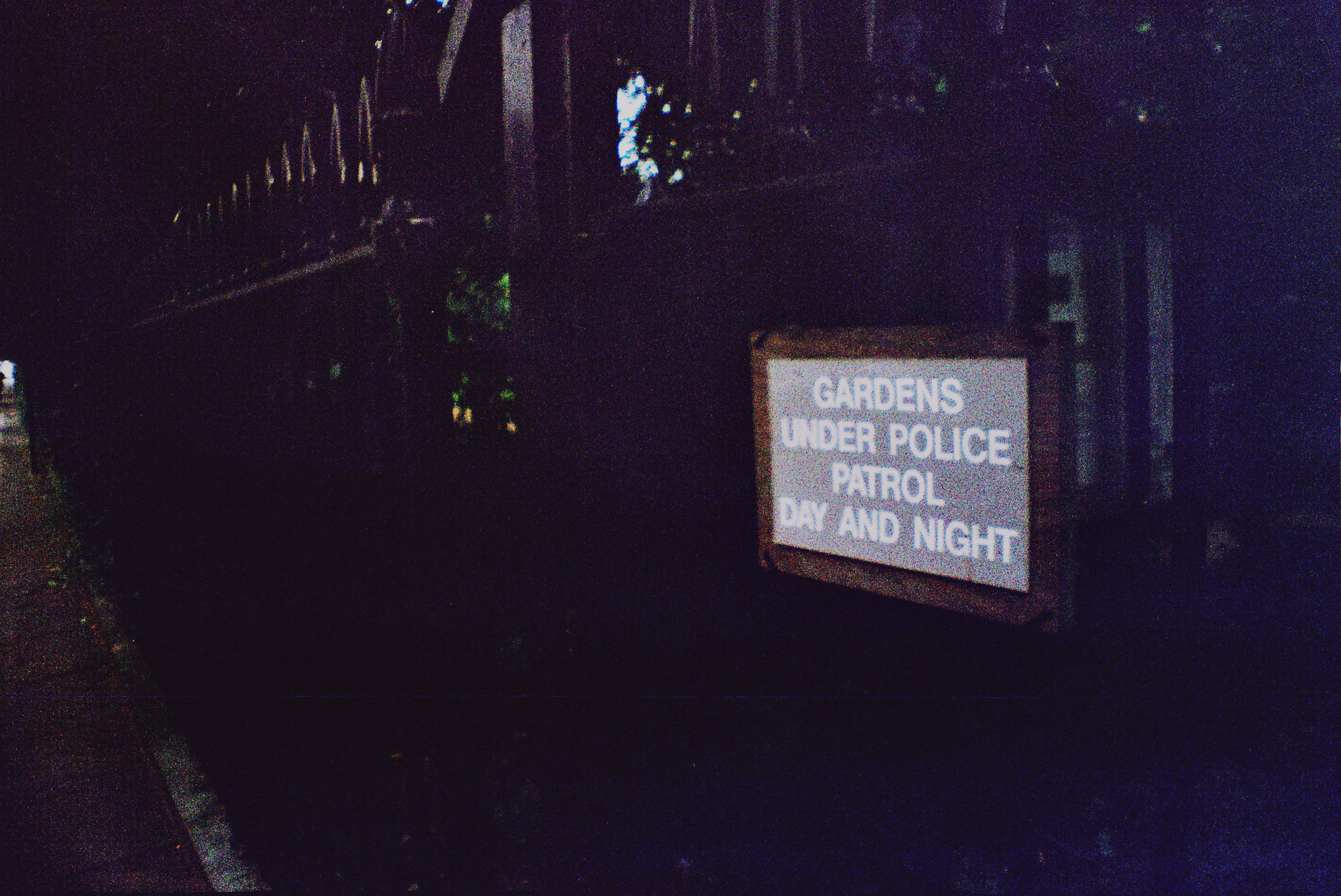 Finding No.14, it dawned that the very house I wanted to see happened to be the only one in the beautiful road to be undergoing maintenance work, covered with an ugly scaffold exoskeleton. I couldn’t hide my disappointment as I tried in vain to capture the house as Barry Bevins had done brilliantly for the BBC 40 years earlier. Even the presence of a Morris Minor wouldn’t have helped, the aggressive simplicity of the scaffolding hiding the most typical flourishes of the Georgian properties. I eventually opted to create the shot with a differing house which proved slightly more successful, though not before spotting the odd sign on the private gardens implying there was a “police patrol” guarding it “day and night”. I thought as well of Nairn’s short documentary No Two The Same from 1970 where he begins an evaluation of the area by walking into this pleasant garden space. I’d be willing to bet the aggressive privacy of such a space today would rile his tendency for public openness. My next stop was some way away and further out than all of the other stops so I walked on knowing that, this being a Saturday, the peace was likely to be gradually diminishing as the hours and minutes fell by.