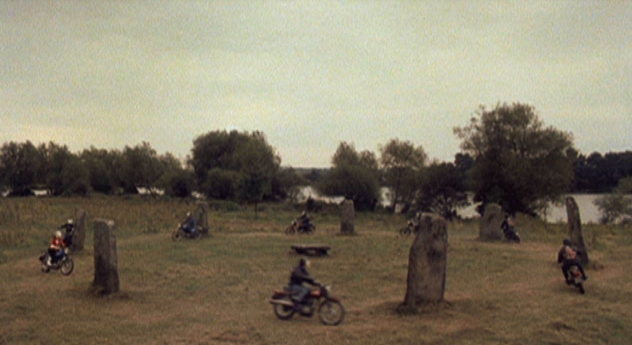 Motorbikes, of course, became a strangely prominent image in cinema of this post-Easy Rider period, especially the of more esoteric kind. In The Satanic Rites Of Dracula (1973), the elusive count, who has since become a property barren living in a high-rise, has his henchman travel around on motorbikes, all of course wearing matching, and not to say fetching, sleeveless sheep-skin jackets. Whilst in Pete Walker’s Frightmare (1974), the motorbike gang becomes a symbol of the young going astray into the hoodlum, albeit hiding a darker secret of Home Counties cannibalism; an irony where the real danger is from a pair of OAPs living in a country cottage. Yet this is besides the main point, that of rurality, which is better surmised by Don Sharp’s Psychomania (1973); a film that has a motorbike gang harness the power of a stone circle to come back from dead and to haunt the suburban realms. It is essentially an inversion of Gladwell’s film that sees his gang travelling from nearby Ipswich in order to cause fear and violence in the village-zones.
