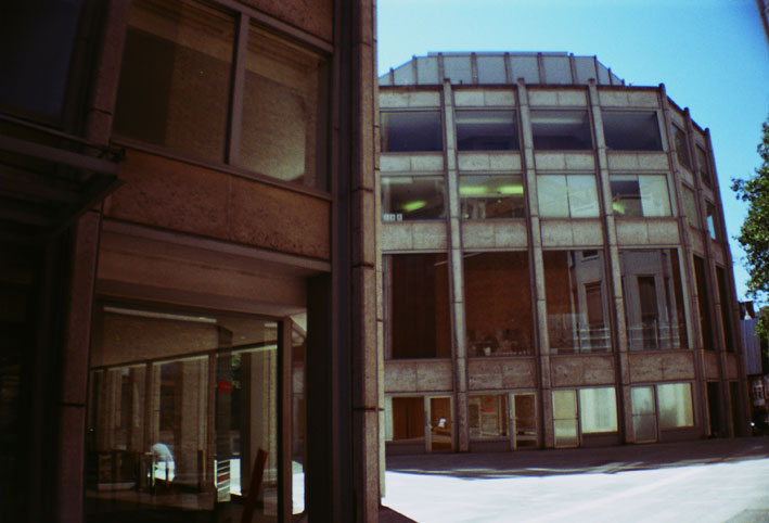 I first made a trip to the Economist Building in Piccadilly; a building more famous for opening Michelangelo Antonioni’s 1966 film, Blow-Up. In the film, a mad-cap group of mimes drive a jeep into the square created by this building and generally mess around. Antonioni, perhaps even deliberately, captures that same mixture of naive play and potential usage of the space. Walking around it today reveals a strangely Smithsonian ideal of a handful of people meandering around, cut out like collages and stuck on to the space; simultaneously interacting with it whilst not being a part of it, such is the emphasis on the inhuman materials that make up the building. It’s almost Vorticist.