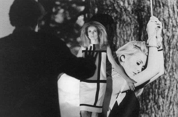 The actress had become a symbol from this film, playing a woman turned prostitute but never losing the grace that her poise almost always demanded. Her hair was long, both in the film still and in reality, being of such a light blonde as to almost fade into the air like a spectral wisp that haunted her footsteps. I was finishing the preparation of various cameras when she was finally allowed into the studio ready for the shoot. She had not changed in the intervening years since the film. Newton showed her the backdrop with pride and the actress nodded with a passing smile of acknowledgement, before removing her coat to reveal an extravagant dress. The design reminded of a painting by Mondrian; there were already many conflicting spirits in the room. Newton lined the actress up against the backdrop, positioning her with the same strict directorship that had undoubtedly created the film still. In the photo, the actress is tied up against a tree, about to enjoy a fantasy of entrapment. She would not look towards the photo once acknowledged, standing almost rigid as if the memories it alighted were somehow too powerful to consider. She was stood with her hands behind her back, leaning upon her earlier memory as if it were a casual street wall.
