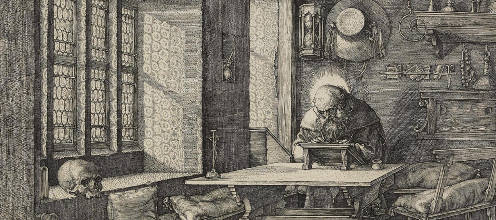 An old man is sat at a desk. His intelligence burns brightly above is head like a white halo as he writes in ink on a raised platform. His room is filled with things; measuring equipment and scientific apparatus, a skull, cushions, a lion, a dog and many books. The light from outside translates the designs of the glass windows onto the adjacent wall while a small model of the crucifixion of Christ stands facing him on his desk. This is the general detailing of Albrecht Dürer’s etching of St. Jerome in his study from 1521 and is absolutely typical in how the artist used a cacophony of detail to highlight a wider, philosophical whole.
