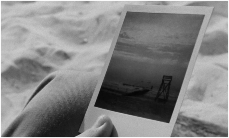 The Polaroid camera is an essential part of the narrative, so much so that many of the posters advertising the film show Philip holding the device. There is a reason for this in that many scenarios in the film use the Polaroid to question the perception of the character and his detachment from reality. The poster in question sees the character sat under a boardwalk by a beach. In the scene it references, he takes out his camera and we see the landscape that he intends to photograph first. It is a fragment of beach furniture sticking out from the shoreline. He takes a photo and waits a little while for it to develop before staring at it.