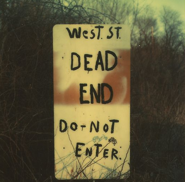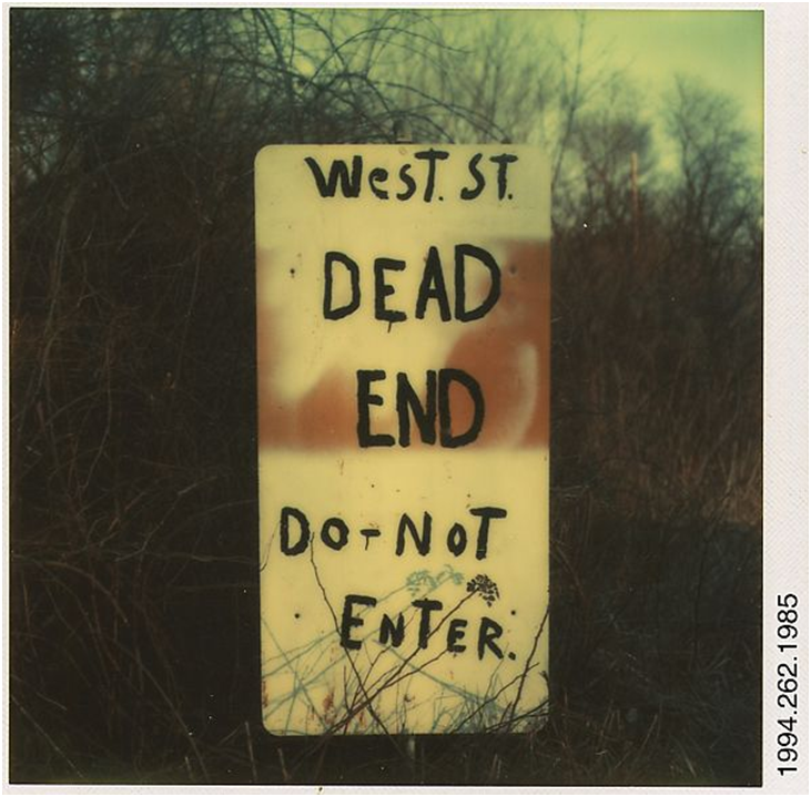 The latter is a reference to a series of images Evans took just before his death; focussing on a hand-painted road sign, West St. Dead End. It is one of the last photographs he took.