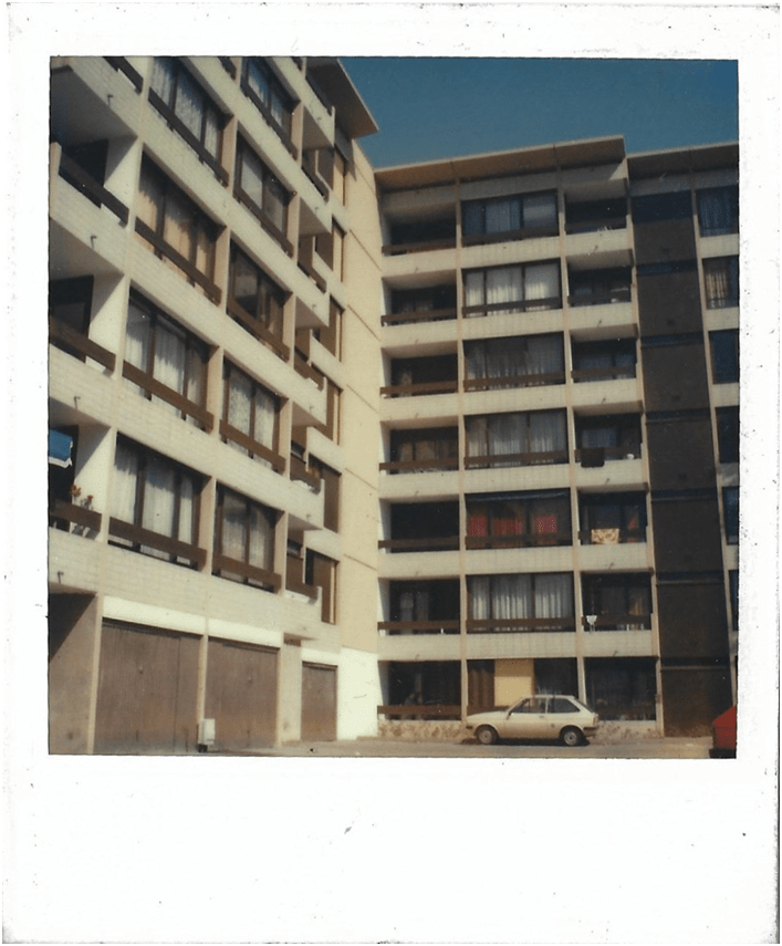 Imagine for a moment holding the Polaroid of the flats after it had developed. By placing yourself within this half-imagined vision, viewing the Polaroid becomes a highly charged act of time travel. Feel the sun glinting off those windows of the complex, the texture of the paint of the garages as it peels and flakes to the touch, the strange flapping sound of the damp towels drying on the balconies. Perhaps there is a pool on the other side of this complex; we can hear splashing and cries. There is movement and light and change, perhaps more so when our eyes are averted. But something living is there and that feeling is derived from just how tangible the past is when perceived in a Polaroid.