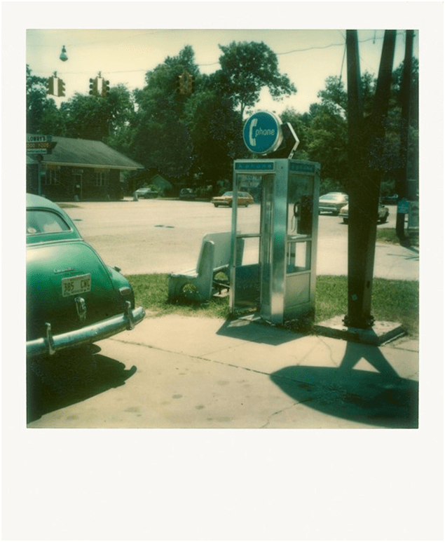 There’s a contradiction here, between the subject of the Polaroids and the feelings they express. These feel like places where life has ceased to turn, except for those just passing through. They are forgotten places, empty telephone boxes, banks closed during lunch hour, parking lots where the weeds grow. It’s easy to see how the images influenced Wim Wenders and Robby Müller to a degree; the characters of their films share that same quality of passing through. Time here is different to Tarkovsky’s patient Polaroids as Eggleston implies his own momentum within the photos. It is he who is on the move, just like the unseen figures that brought the cars and bottles of coke to his attention.