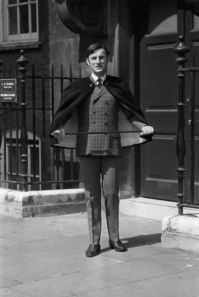 Adamant is a swashbuckling Victorian hero, transported forward to, as his sidekick Georgina (Julia Harmer) informs him early on, the “Swinging city”. Though he finds the morality of the place somewhat off kilter to his gentlemanly world of late Victorian London, it seems that he generally does fit in. In spite of not changing his outfit of nineteenth-century dinner-party attire, he doesn’t seem to attract much attention among a London teeming with Regency Mod and Peacock fops. Several promo photos show the character with the trademark sixties mini (he manages to live atop of a brutalist car park), while even general photos of the period show Harper in real life donning a kind of (beautiful) costumish attire for being out and about in the city. Even the programme’s logo has an essence of the past and present’s collusion (similar to The Kinks’ various typographies and stylings); both era’s seem about stylish adventure and attention-grabby dandyism.