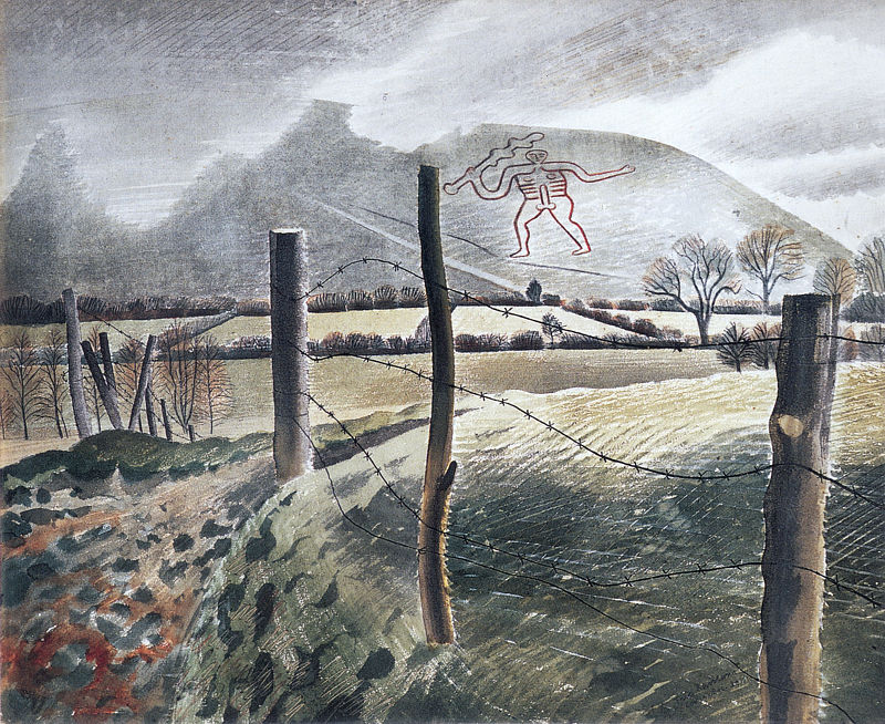 A naked man lies on a Dorset hill whilst another is painting him, quickly.  Eric Ravilious is on a fleeting trip to just north of Dorchester and the war, already broken out, is on his mind.  He paints the man, the land around and the humanity of the hills, quickly.  The man is the Cerne Abbas Giant, a mysterious earthwork of a primitive man with … Continue reading Responses: Eric Ravilious’ Cerne Abbas Giant (1939)